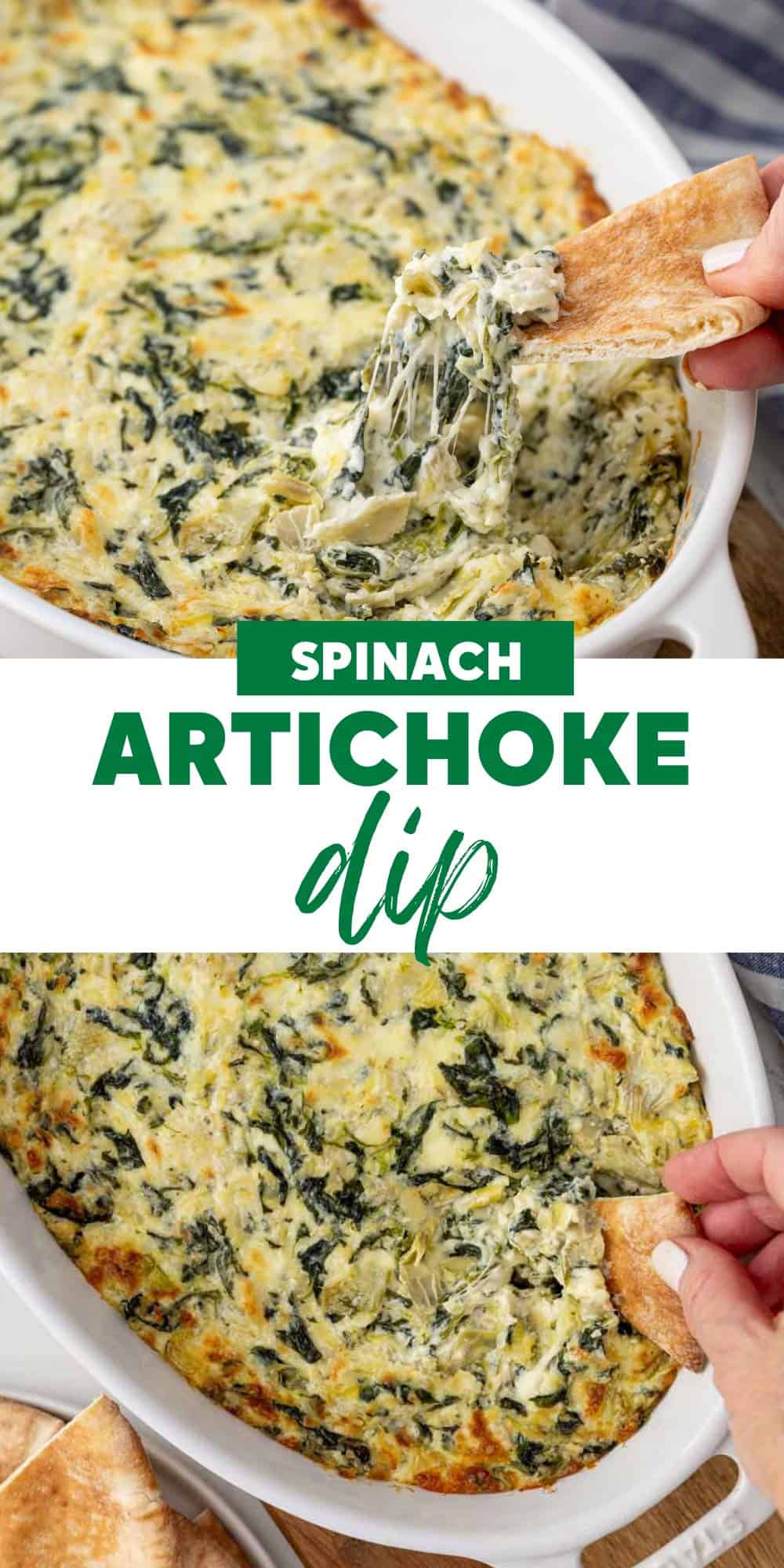 This hot, creamy, and cheesy Spinach Artichoke Dip is baked to perfection with frozen spinach, canned artichokes, and other simple ingredients. It’s always a welcome appetizer for holiday parties, game day, or any special occasion!